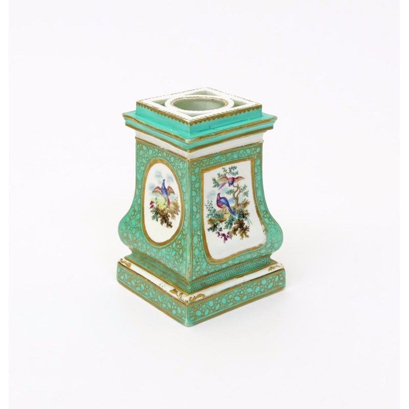 A Sèvres hyacinth bulb pot c.1755-60, the shaped square form later decorated probably in London with panels of fancy birds reserved on a pale green cailloute ground, restored, 13.5cm.
