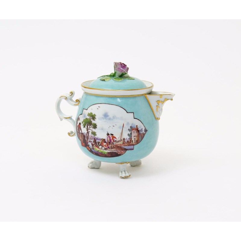 A Meissen cream pot and cover mid 18th century, painted to two sides with a shaped panel of traders at the quayside in a busy harbour scene, reserved on a pale blue or turquoise ground, raised on three lion paw feet, the cover surmounted with a rose finial, blue crossed swords mark and gilt H, small damages, 14cm high. (2)