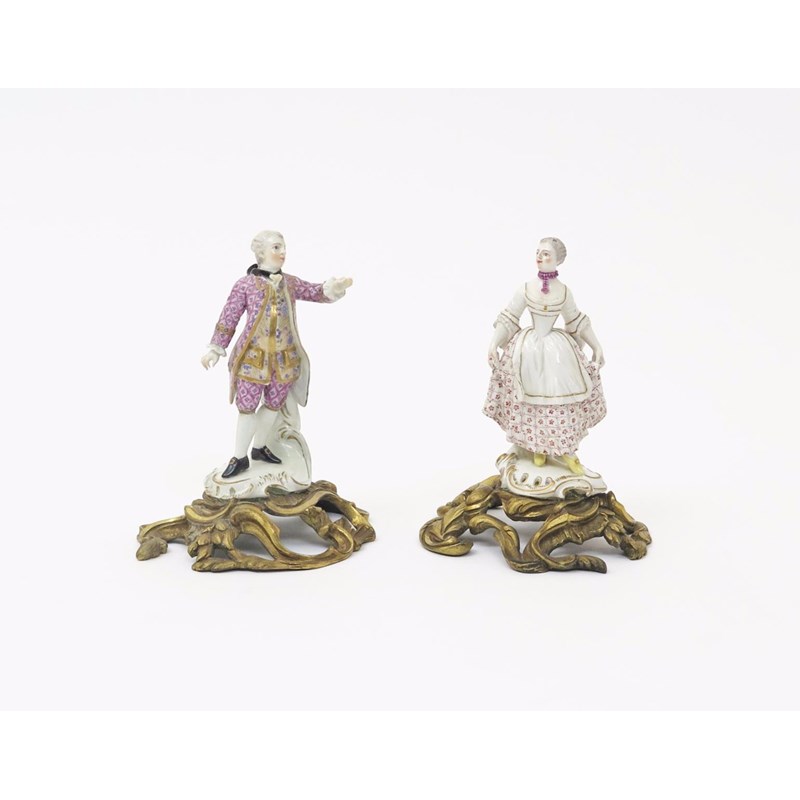 A pair of ormolu-mounted Meissen figures of a gentleman and his companion c.1760-70