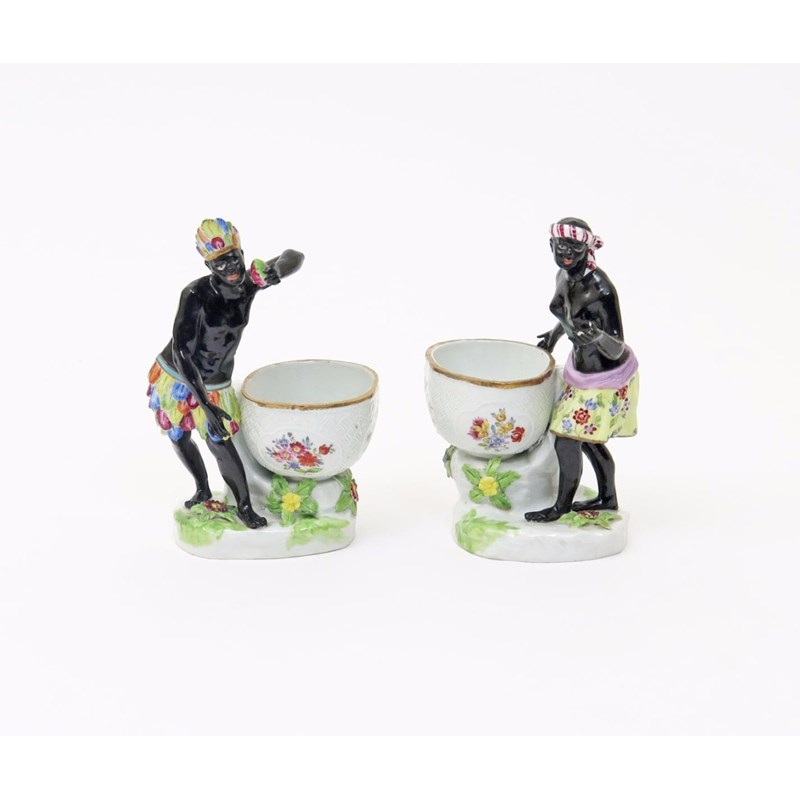 A pair of Samson sweetmeat figures 19th century, after Kandler's models at Meissen, each modelled as a blackamoor wearing a skirt and a headdress, each standing beside a large basket painted with flowers, pseudo blue crossed swords marks, small chips to the fingers, 17.2cm. (2)