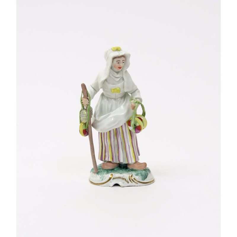 A Frankenthal figure of a toy seller dated 1777, probably modelled by Karl Gottlieb Lück, holding strings of brightly coloured rings and toys, wearing a striped skirt and brown clogs, raised on a low scrolled base, blue crowned CT monogram and 77 mark, a little good restoration, 15.5cm.