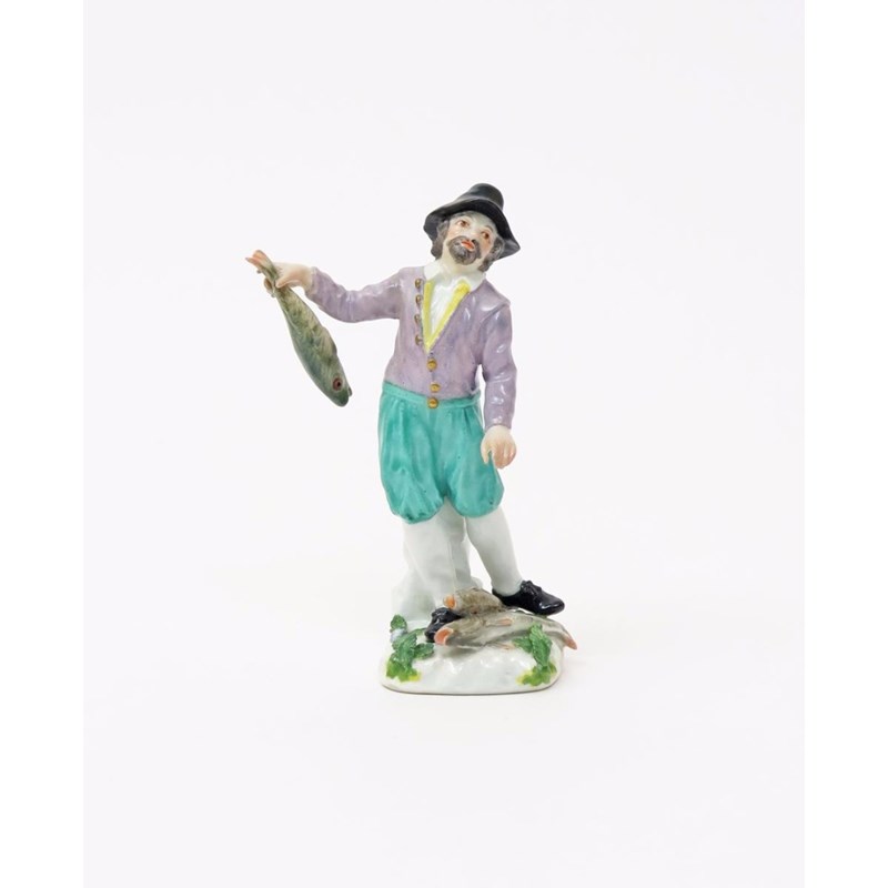 A Meissen figure of a Dutch fisherman mid 18th century, modelled by Peter Reinicke, standing with his right arm outstretched and holding the end of a large fish, two further fish on the ground in front of him, blue crossed swords mark, restored, 14.2cm.