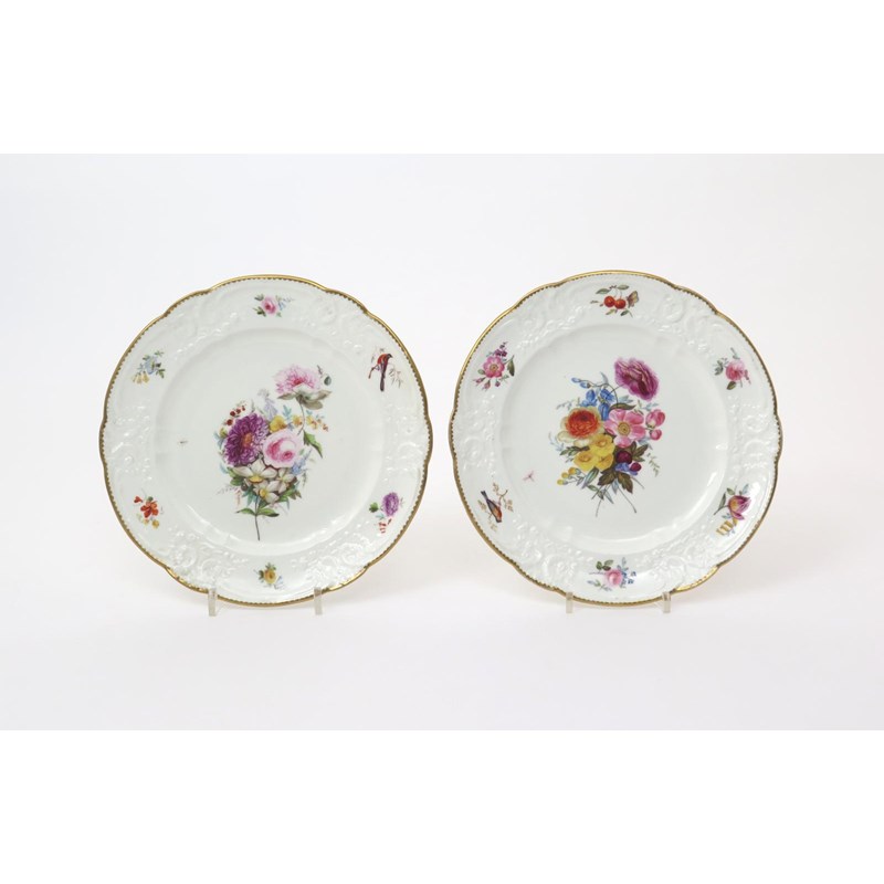 A pair of Nantgarw plates c.1817-20, of Brace Service type, painted in London in the Bradley workshop with a central spray of flowers, the rims moulded with flowers and C scrolls reserving six panels painted with a bird, floral sprigs and a spray of cherries, impressed NANTGARW CW marks, 25cm. (2)