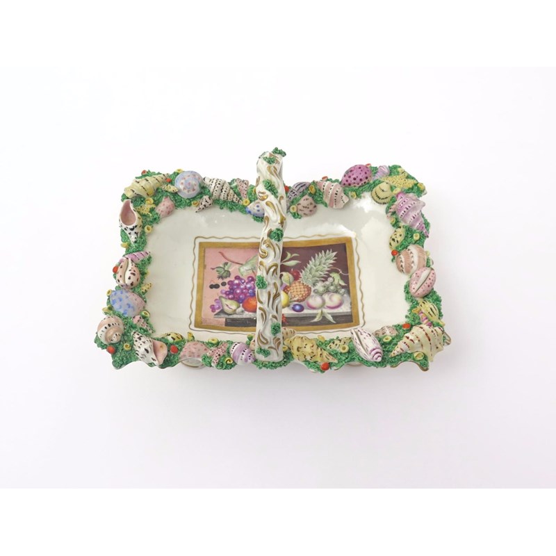 A good Chamberlain Worcester basket c.1840, the well painted with a bold arrangement of fruit including fig, pineapple, grapes, lemon, pear and plum on a marble table top, the rim applied with a variety of shells on a bed of bright green seaweed, raised on a scroll moulded base, 22cm across.