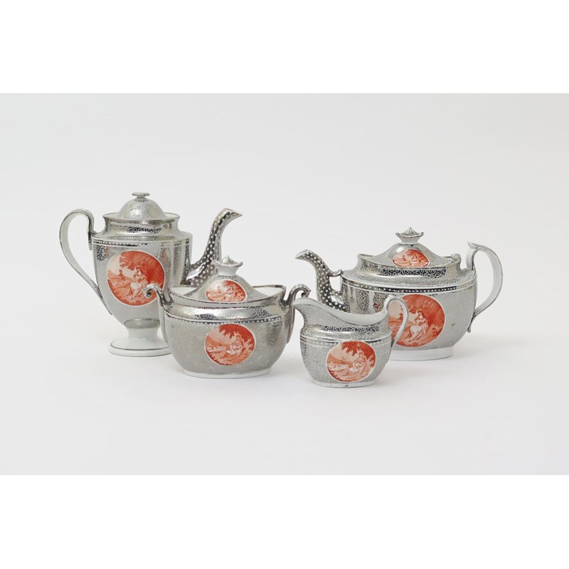 A rare Factory Z (Staffordshire) silver lustre part tea and coffee service c.1795-1805, printed in red with a bucolic scene of a young maiden holding a lamb, a boy driving a flock of sheep behind, reserved on a silver lustre and vermicelli ground, the spouts with white dots, some damages. Comprising: a coffee pot and cover, a teapot and cover, a sugar bowl and cover, and a milk jug. (7)