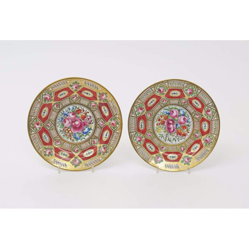 A pair of Coalport plates c.1805, richly decorated in the Church Gresley pattern with central floral roundels within a geometric border of rose motifs and leaf panels, small star cracks, 21cm. (2)