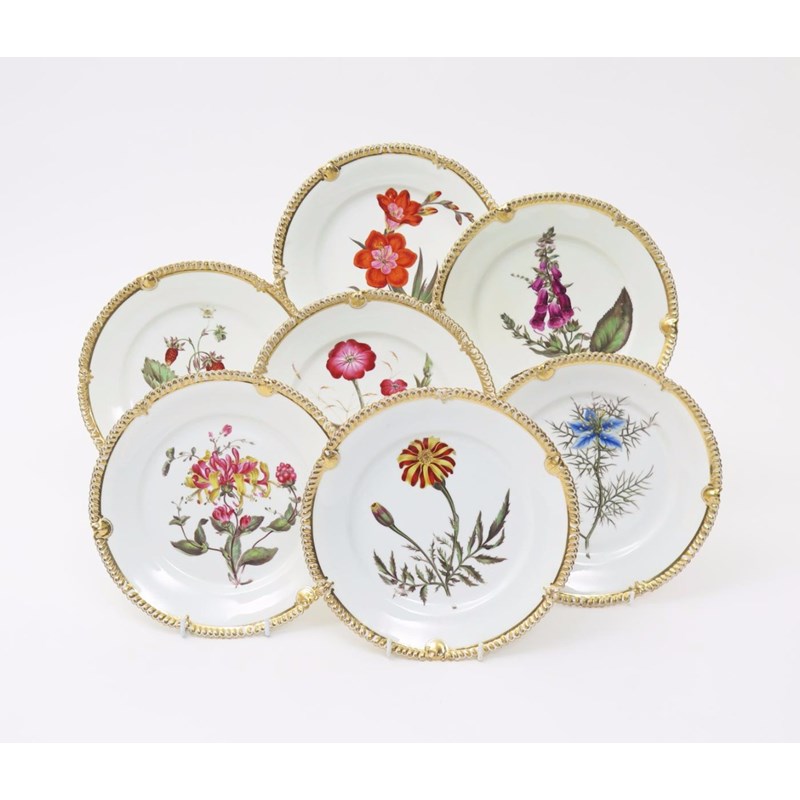 Seven Chamberlain Worcester botanical plates c.1815-20, each plate finely painted with a single floral specimen, titled to the reverse with Saffron Coloured Ixia, Strawberry of Versailles, Campion, Woodbine, Fox-Glove, Love in a Bush, and French Marigold, the rims moulded with a shell and ovolu design highlighted in gilt, script factory marks, some faults, 21.5cm. (7)