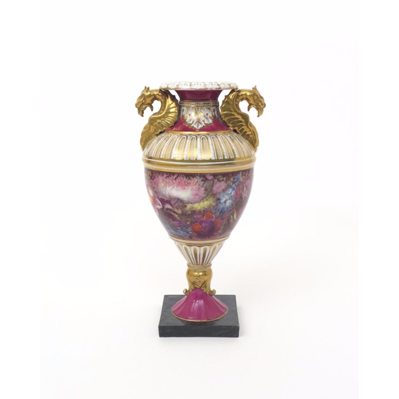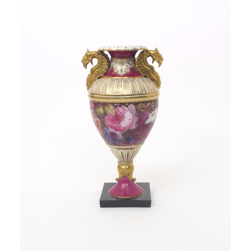 A Chamberlain Worcester two-handled vase c.1810-20, the ovoid body painted with a continuous band of flowers including convolvulus, rose, poppy and iris, the foot and neck with a deep puce ground, applied to the shoulder with two gilt griffin head handles, raised on a square black foot, painted mark, the cover lacking, 33cm.