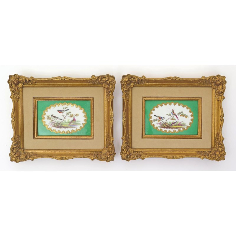 A pair of Derby porcelain plaques c.1835, attributed to Horatio Steele, each painted in the Sèvres manner with colourful birds perched on and beneath leafy branches, reserved in a gilt C scroll cartouche on an apple green ground, the plaques 10.5cm x 16.5cm. (2)