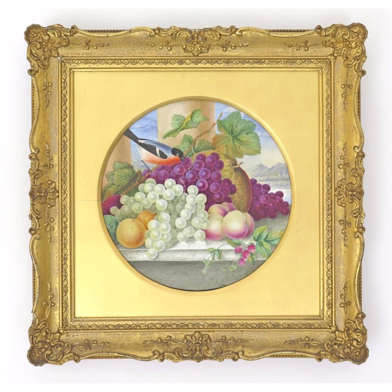 A large English porcelain plaque 19th century, painted with a bullfinch perched on a stem of fruiting grapevine above other fruits including raspberries and peaches on a marble ledge, a view of misty mountains in the background, in a giltwood frame, 39cm overall.