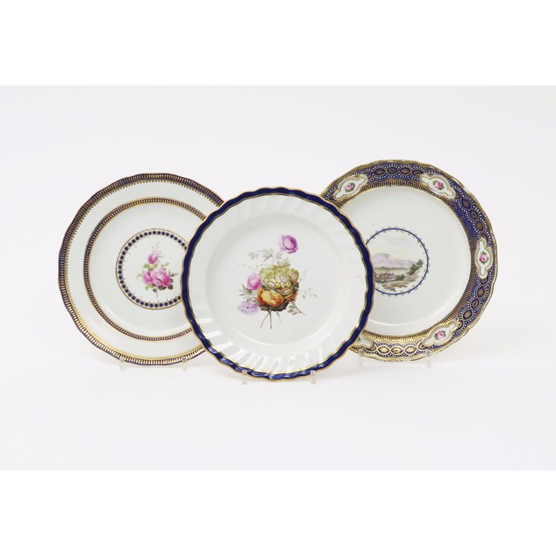 Three Derby plates late 18th century, decorated by William Billingsley, one in pattern 100 with a central flower spray within a spiral moulded blue line rim, one in pattern 18 with a spray of pink rose within gilt and cobalt blue bands, the last painted in the Sèvres manner with a landscape roundel by Zachariah Boreman within a border of Billingsley rose panels on a blue border highlighted in gilt and white jewelling by Thomas Soar, puce factory marks, the last with a long-tailed 7 inside the footrim, some wear, 23cm max. (3)