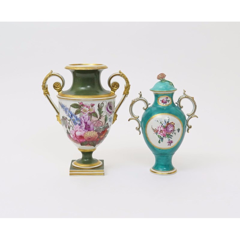 A Derby two-handled vase and cover c.1770, the ovoid form painted to each side with an oval panel of flowers, with smaller panels echoed to the neck, reserved on a sea green or French green ground, and a later Derby vase finely painted to one side with garden flowers including poppy, rose, dahlia and forget-me-not, reserved on a green ground, some restoration to the first, 29.5cm max. (3)
