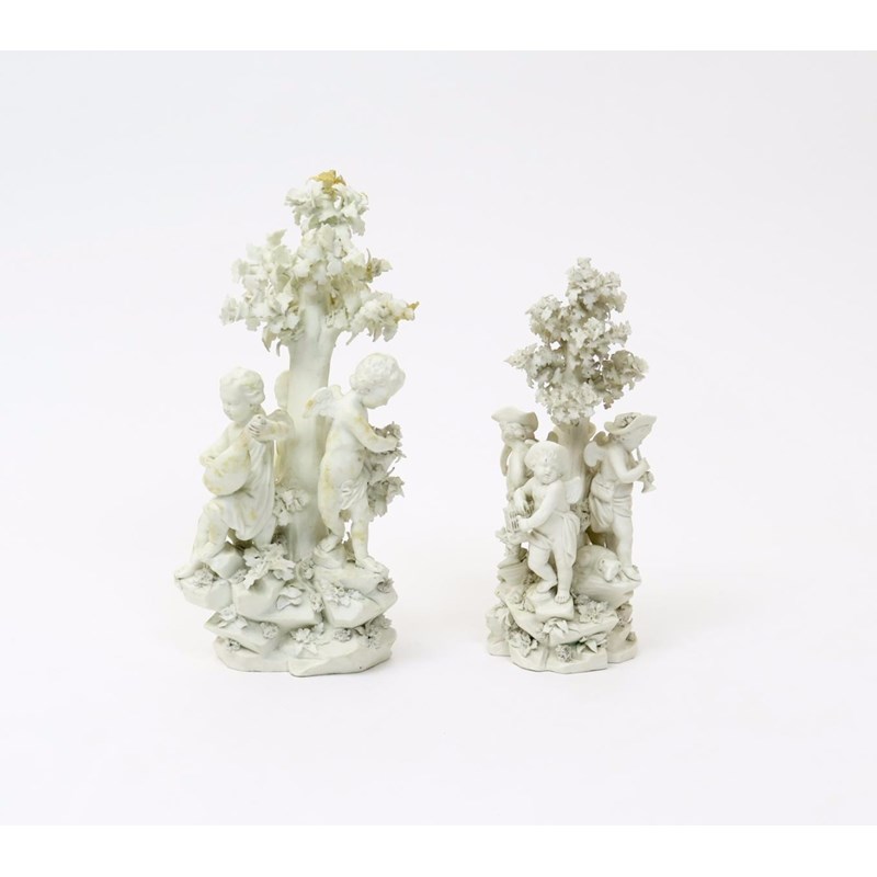 Two Derby biscuit porcelain figure groups c.1775, one of three putti seated on a rocky base around an oak tree, one playing the lute, another holding a basket of flowers, the last with a dog, the other of four putti wearing hats, similarly arranged around a tree, with a dog, a hunting horn, a bird cage and a bugle, incised marks and numbers 252 and 251 respectively. some damages, 27cm max. (2)