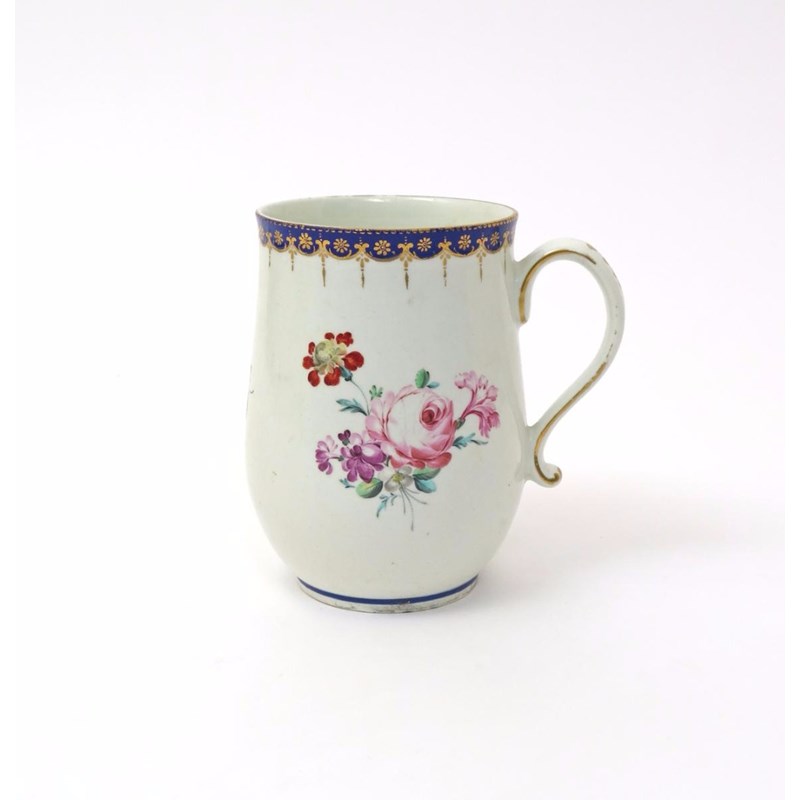 A large Derby bell-shaped mug c.1770, painted in the manner of Edward Withers with simple polychrome flower sprays and single scattered blooms, the rim with a border of gilt flower heads on a deep blue ground, 16cm high.