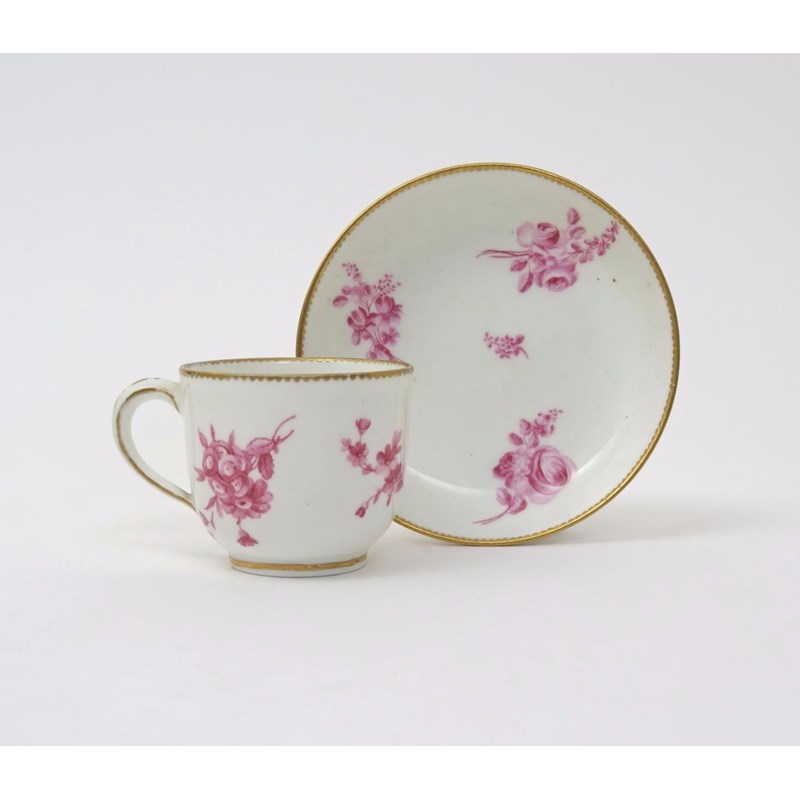 A Sèvres cup and saucer c.1765-70, painted in pink monochrome with small sprays of flowers, within gilt dentil rims, the cup with an interlaced LL mark, the saucer with a rare blue chalice painter's mark, 12.7cm. (2)