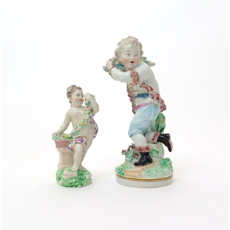 Two Derby figures emblematic of the Seasons c.1775-90, one of a female putto probably representing Spring, holding a garland of flowers and resting against a low square plinth, incised No. 64 to the base, the other of a young boy representing Winter, holding a bundle of faggots on his shoulder and wearing a fur-lined coat, some good restoration, 20.5cm. (2)