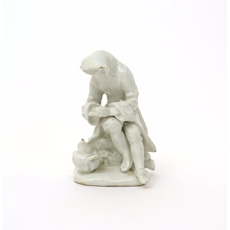 A Bow white-glazed figure of Winter c.1755, from the Rustic Seasons series, modelled as an old man huddled over a flaming brazier and wearing a hooded coat, minor losses, 13cm.