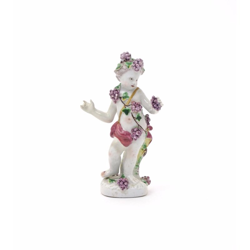A rare Samuel Gilbody (Liverpool) figure of Autumn c.1756-60, modelled as a putto draped in fruiting grapevine and holding a single bunch of grapes in his left hand, some restoration, 13cm.