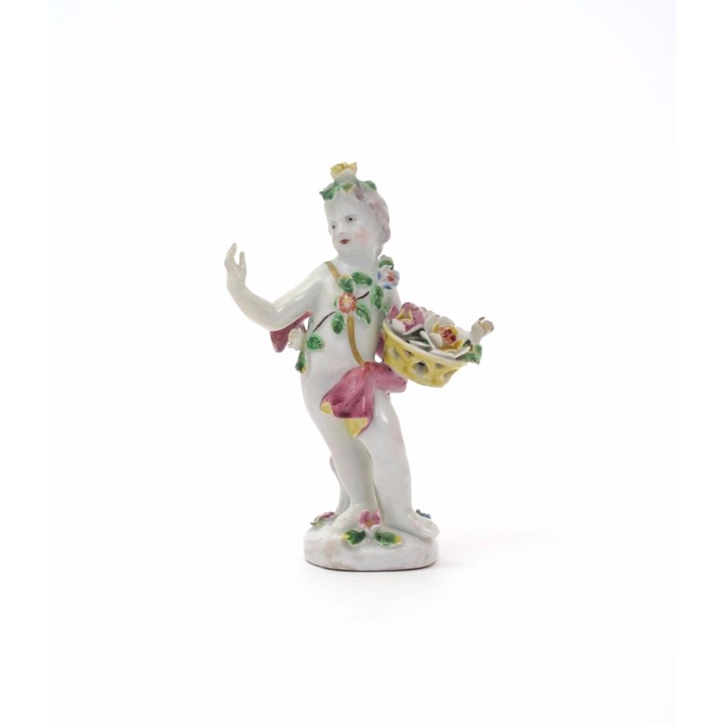 A rare Samuel Gilbody (Liverpool) figure of Spring c.1756-60, modelled as a putto holding a basket of flowers in his left arm and further draped in a floral garland, the low base applied with small flowers, some restoration, 12.5cm.