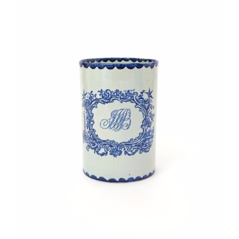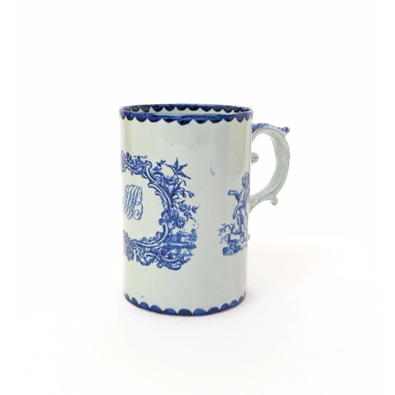 A rare and large John Pennington (Liverpool) blue and white mug c.1779, printed with an elaborate scrolling cartouche, the top corners with birds perched atop, the bottom left corner with a ship mast behind boxes, the right with ducks swimming before a tower, the centre containing the monogrammed initials JMB, either side of the cartouche decorated with a lion rampant, a long restored crack, 21.3cm high.