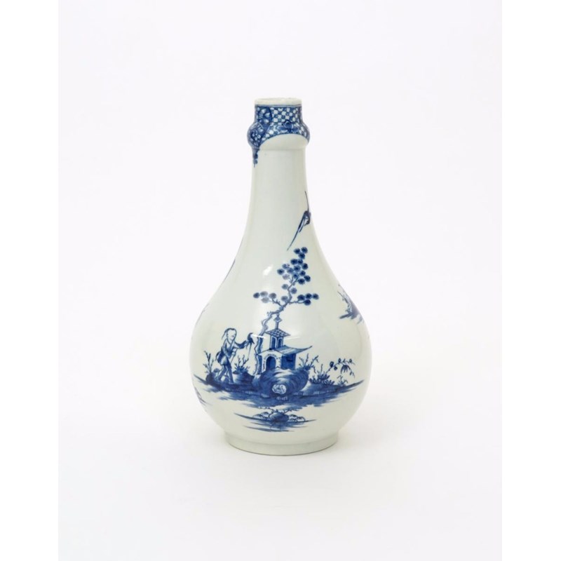 A good Worcester blue and white water bottle or guglet c.1760-65, painted with the Willow Bridge Fisherman pattern, a figure traversing an arched bridge with two further figures fishing from a sampan beneath, the reverse with a figure and a bird beside a small pagoda beneath pine, the ovoid body rising to a knopped neck, open crescent mark, 24.5cm.
