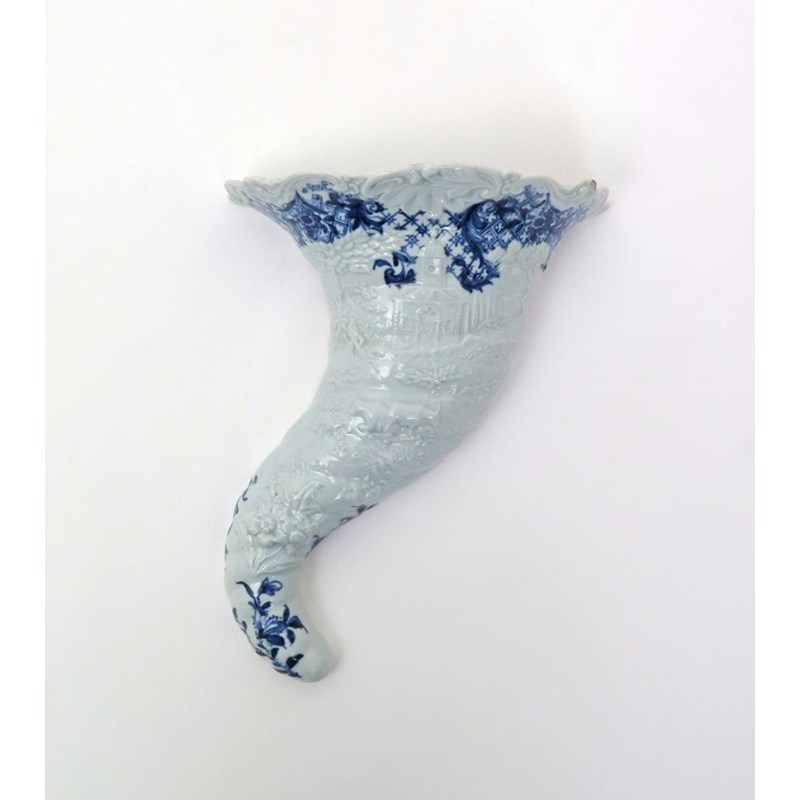 A Worcester blue and white moulded cornucopia wall pocket c.1758