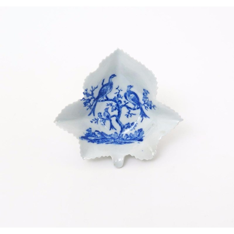 A rare Caughley blue and white pickle dish c.1770, the large leaf-shape dish printed in a bright blue with the Birds in Branches pattern, 11cm.