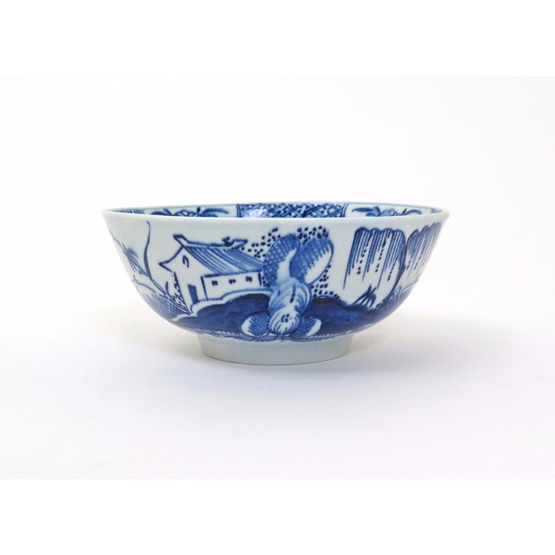 A Bow blue and white bowl c.1770, painted with a small dwelling in an Oriental landscape with weeping willow and flocks of birds in flight, the inner rim with a band of flowerhead mons and hatched diaper panels, painter's numeral 7, a short crack, 15cm dia.