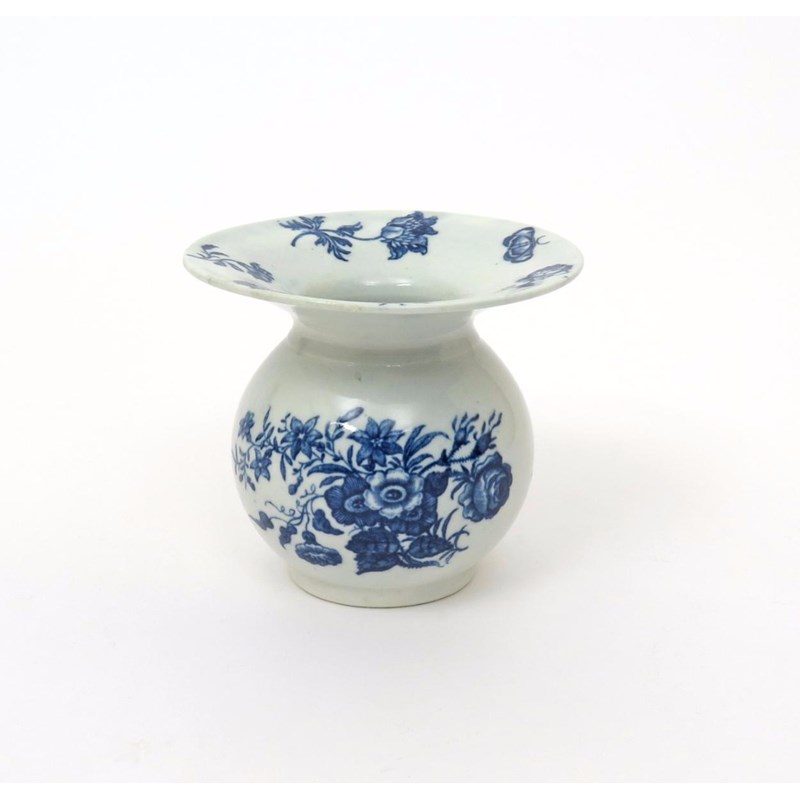 A Worcester blue and white spittoon c.1770, printed with the Three Flowers pattern, the reverse and wide rim with scattered naturalistic flowers, hatched crescent mark, 9.8cm high.