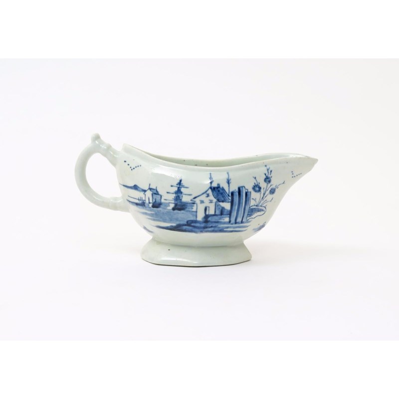 A rare Longton Hall blue and white sauceboat c.1758, each side painted with buildings beside Oriental plants and pylon trees, the moulded handle with a simple scroll design, raised on an octagonal foot, S mark inside the footrim, some restoration, 18cm.
