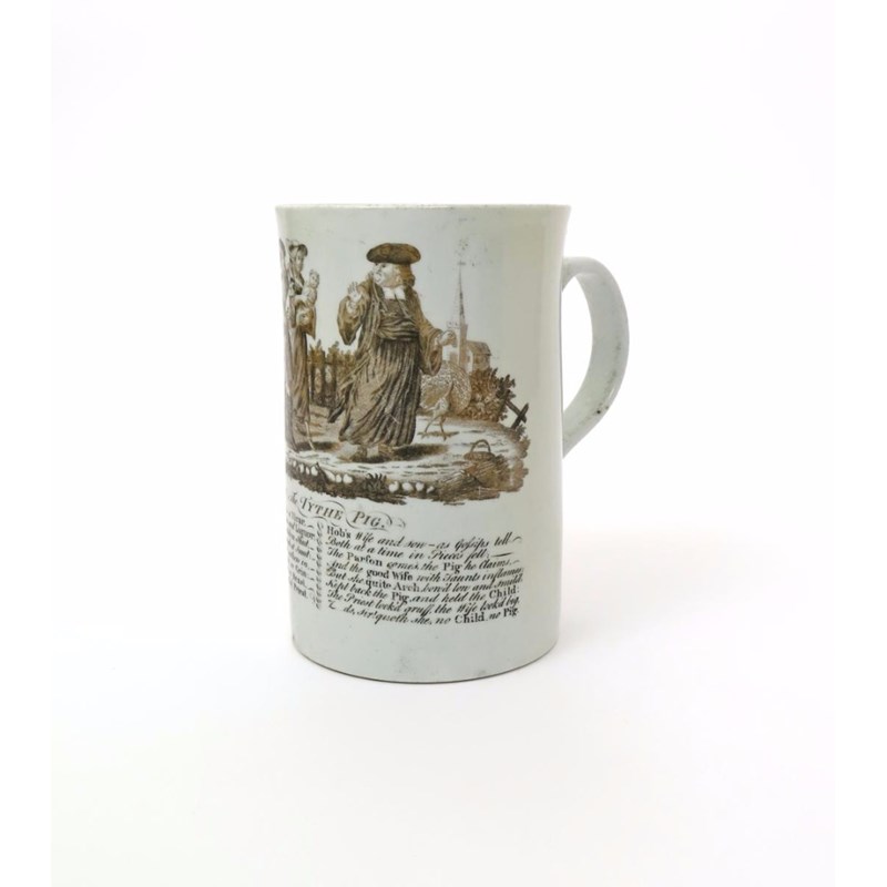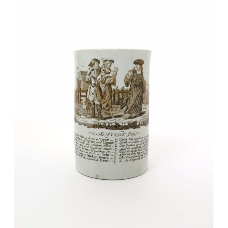 A large Richard Chaffers (Liverpool) mug c.1762-65, the tall cylindrical form printed in black with The Tythe Pig, a young couple offering the village clergyman a piglet and a baby before a farmstead, above a sixteen line verse telling the story behind the picture, a long crack, 16.5cm.