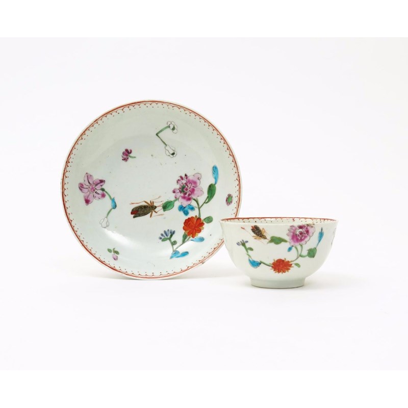 A Worcester teabowl and saucer c.1768, painted in the famille rose palette with the Astley or Harvest Bug pattern, a large insect above a spray of flowering peony, within a red crowsfoot border, 12.3cm. (2)