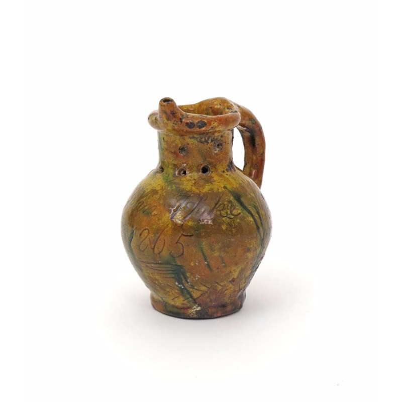 A Donyatt puzzle jug dated 1865, with sgraffito decoration of a man smoking a pipe and a bird perched on a branch, incised 'John Hake 1865', the whole decorated in a mottled green and yellow glaze, 17cm.