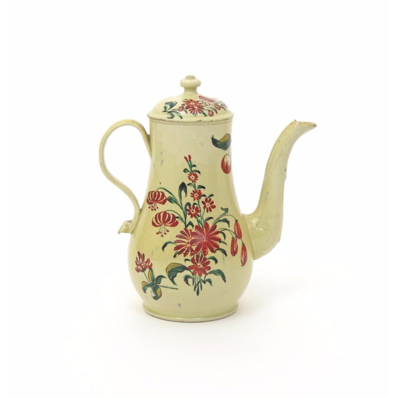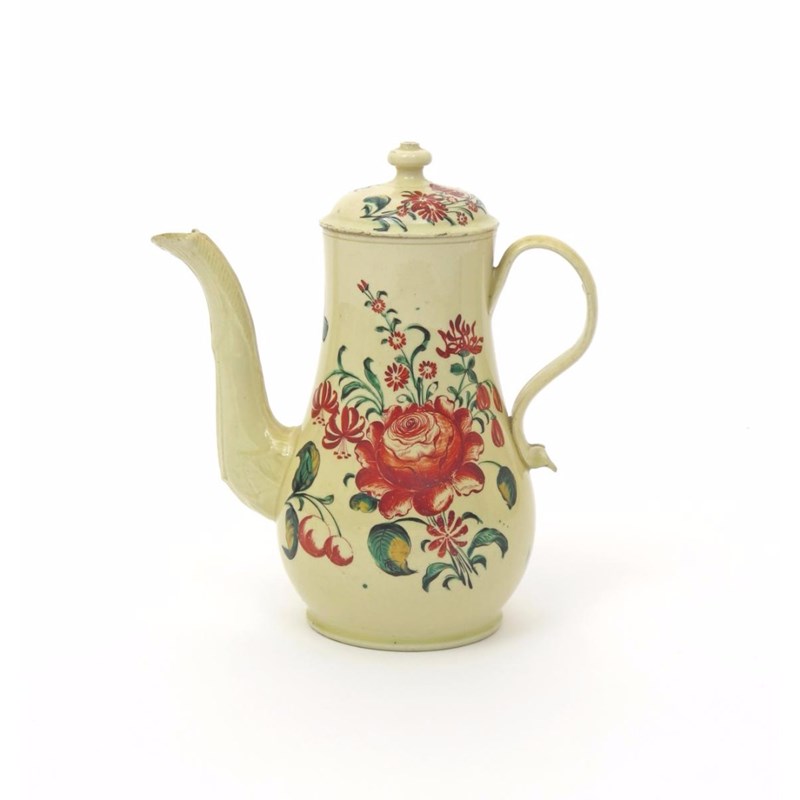 A Cockpit Hill (Derby) creamware coffee pot and cover c.1765-70, the pear-shaped body boldly decorated with a spray of rose and honeysuckle in red, green and black, with scattered cherries beside, the spout moulded with a foliate design, damages to the cover, 21.5cm. (2)