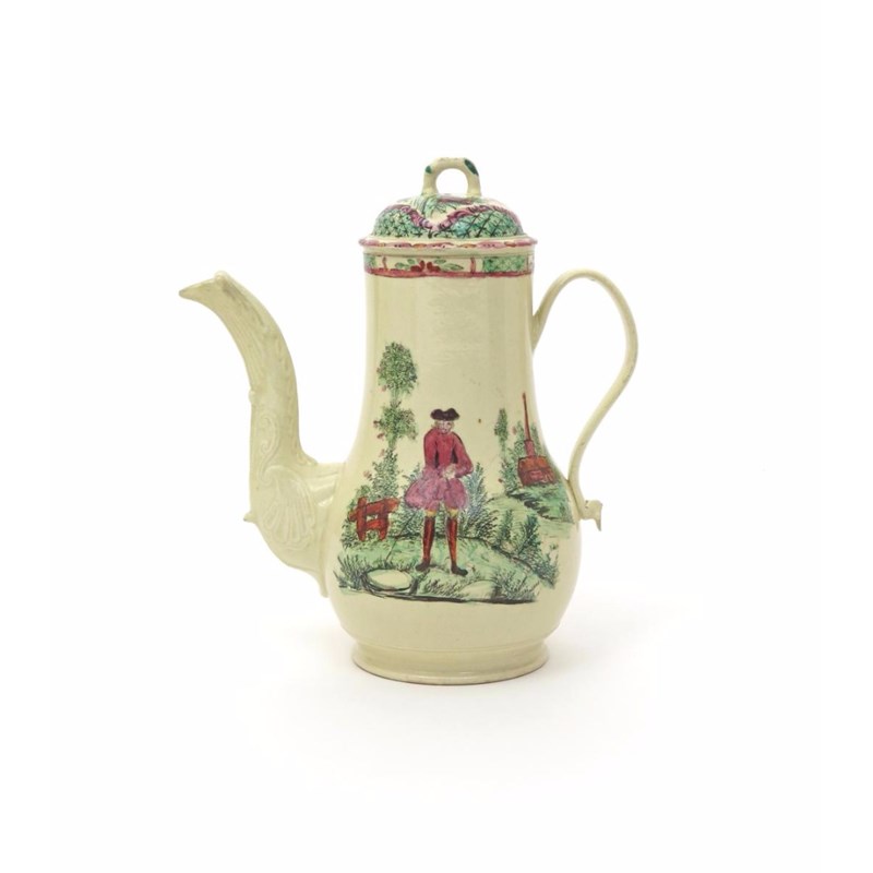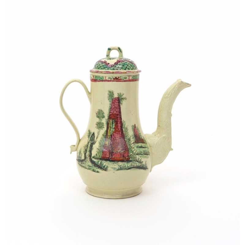 A creamware coffee pot and cover c.1760-70, painted in polychrome enamels, to one side a gentleman in a frock coat standing with a church in the background, the reverse with a ruined obelisk, the spout elaborately moulded, a little restoration to the end of the spout, 23.5cm. (2)