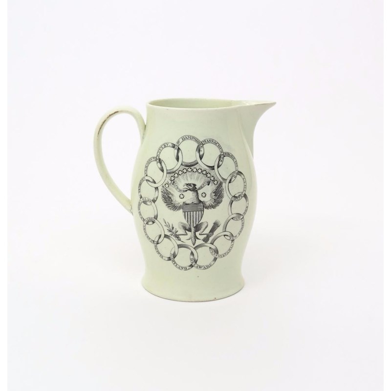A creamware jug of American interest c.1795, printed to one side with the American eagle surrounded by fifteen interlocking rings bearing the names of the first 15 states to be admitted into the Union, the reverse with a hand-coloured print of a ship at sail, a little restoration, 18cm high.