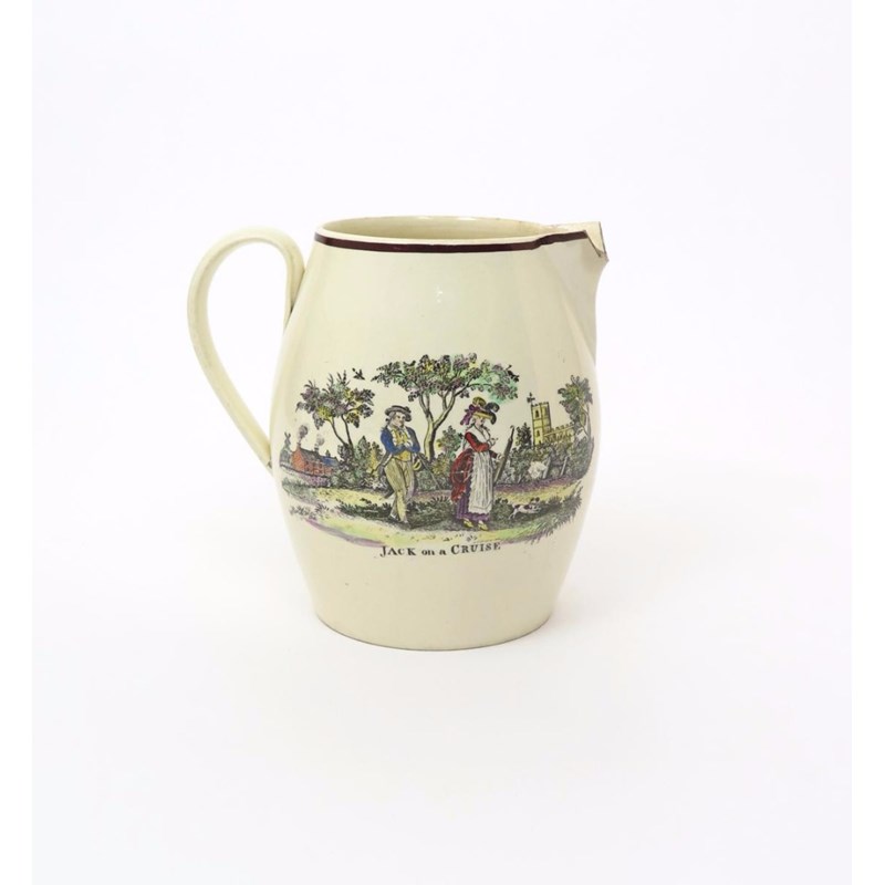 A large creamware jug of naval interest late 18th century, one side printed and hand-coloured with a dandified sailor approaching a young lady in a village landscape, titled 'Jack on a Cruise', the print after Robert Sayer's original of 1782, the reverse with a three-masted ship flying a multitude of flags, damage to the spout, 21.5cm high.