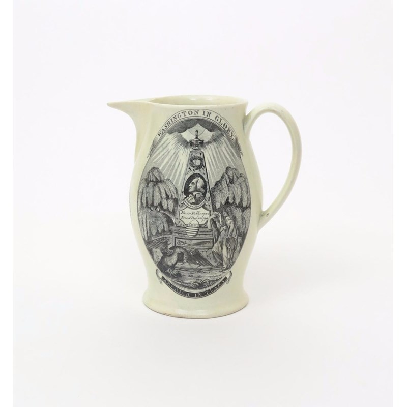 A creamware jug of American interest c.1800, printed in black to one side with an obelisk bearing a portrait of George Washington and his dates, beneath black clouds parting to reveal the sun, a maiden and an eagle weeping beside, titled 'Washington in Glory' above and 'America in Tears' below, beneath the spout inscribed 'A man without example: A Patriot without reproach', the reverse with a four line stanza featuring Warren, Montgomery and Washington, within an elaborate cartouche, some restoration to the spout and rim, 21cm high.