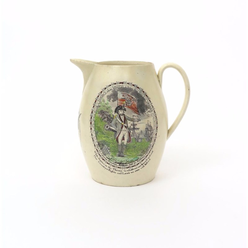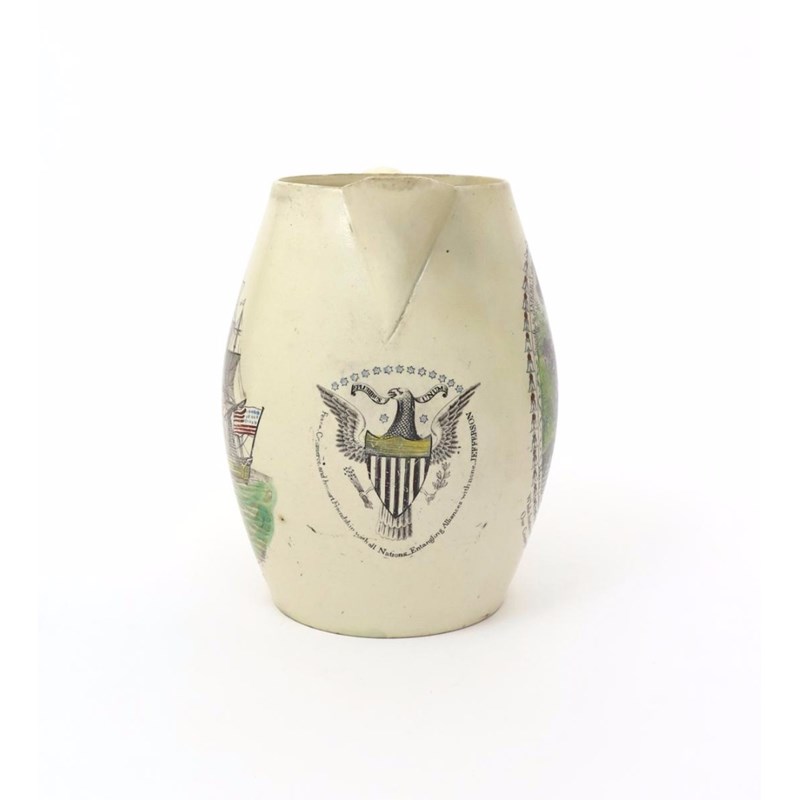 A large creamware jug of American interest c.1804, printed and hand-coloured to one side with a Continental soldier standing beneath the American flag with ships in the background, titled 'Success to America whose Militia is better than Standing Armies, May Its Citizens Emulate Soldiers and its Soldiers Heroes', a further two line stanza beneath, to the reverse a three-masted ship, beneath the spout the American Eagle surrounded by a quote from Thomas Jefferson's inaugural speech of 1801, some restoration, 22.7cm high.