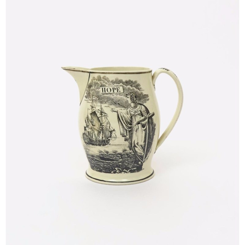 A creamware jug of maritime interest c.1810, printed in black with a figure of Hope looking out to sea towards a three-masted ship flying a flag and a long-tailed pennant, the reverse with two gentleman and their dogs seated on a break from shooting, 17.5cm high.