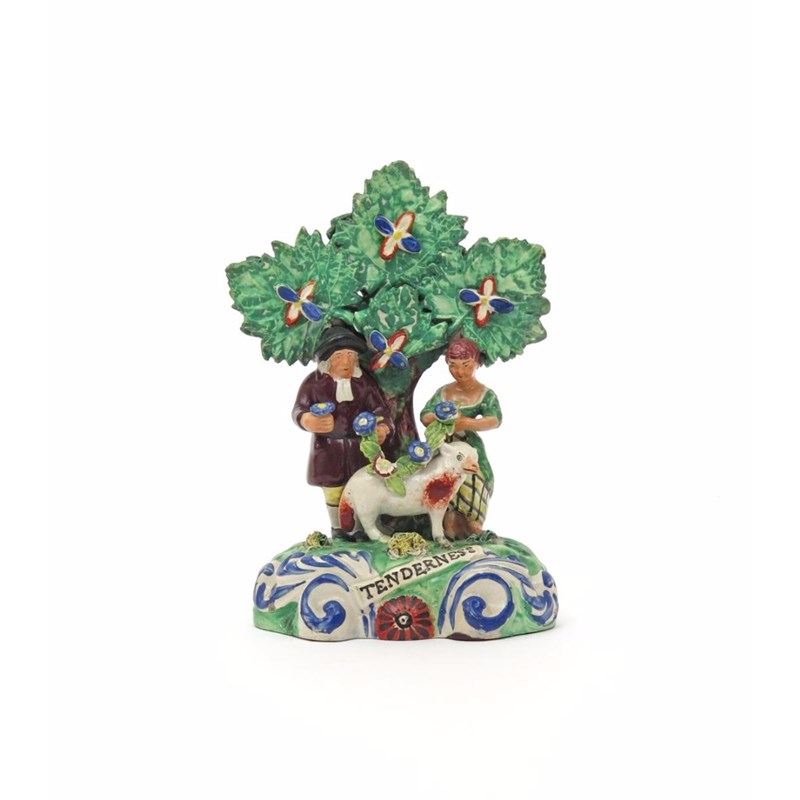 A good Walton Staffordshire figure group of Tenderness c.1820, modelled as a couple and a sheep standing beneath large-leaved flowering bocage and holding a garland of flowers, titled to the front of the scrolled base, impressed mark to the reverse, 18.5cm.