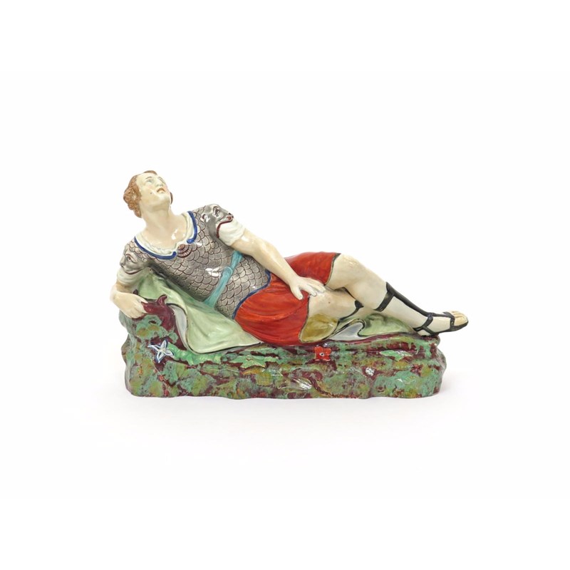 A Staffordshire figure of Mark Antony early 19th century, reclining on a low mossy base, wearing a chainmail tunic with lion mask motifs to the shoulders, holding the hilt of a dagger concealed beneath a green robe, some good restoration, 32cm.