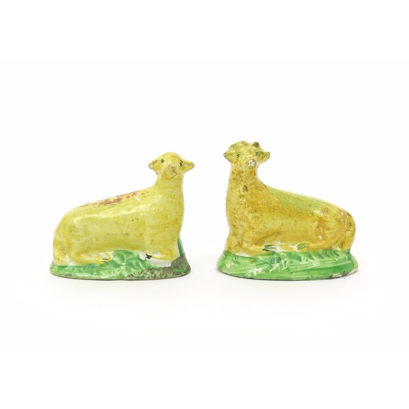 A pair of Staffordshire pearlware models of sheep c.1800, a ram and a ewe recumbent on low grassy bases, decorated in a rich yellow glaze, 7.5cm high. (2)