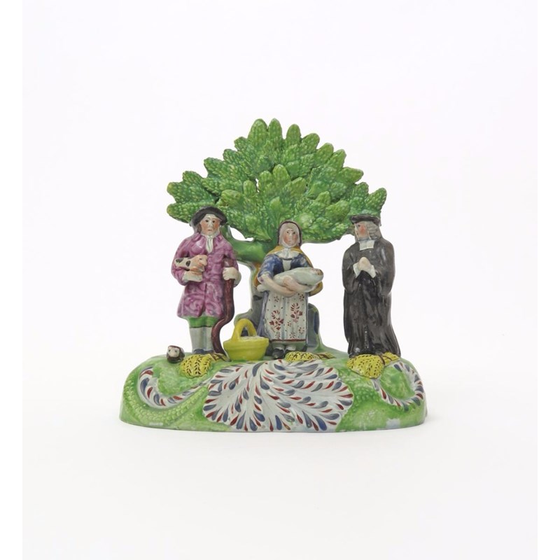 A Staffordshire Tithe Pig figure group c.1820, of a couple and clergyman standing beneath leafy bocage, the man holding a piglet, the woman a baby, sheaves of corn and a basket of eggs at their feet, raised on a scrolled base with so-called 'patriot' decoration in red and blue on white, some good restoration to the bocage, 18cm.