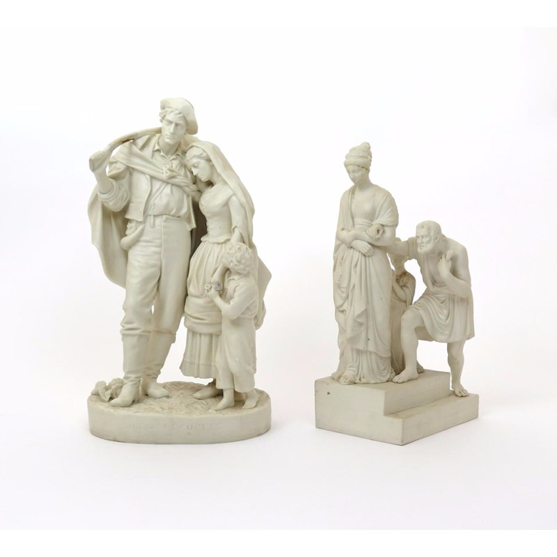 A large Parian group of the Union Refugees c.1861, modelled by John Rogers, a woman holding the hand of her young son and leaning her head wearily on her husband's chest, and a Parian group of a Classical maiden leading an old bearded man across brick steps, with a young girl behind, some damages, 46cm max. (2)