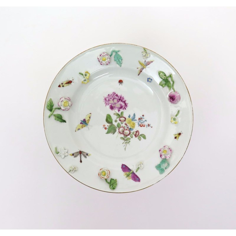 A Meissen plate mid 18th century, the well painted with a floral bouquet within moths, a ladybird and other flying insects, the rim applied with single flower stems, blue crossed swords mark, a few small chips to the applications, 26cm.