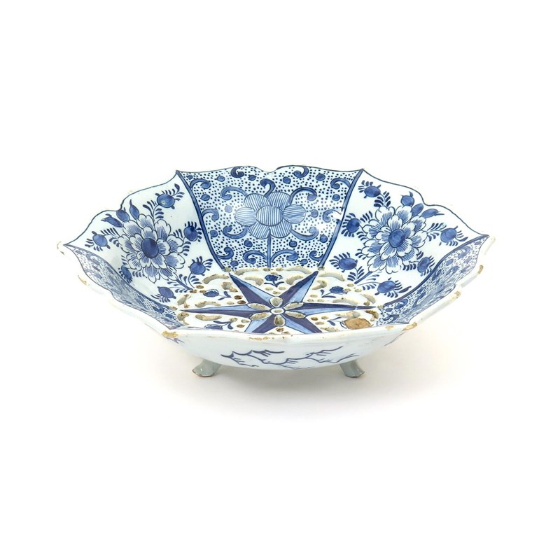 A Delft strawberry dish 2nd half 18th century, the hexagonal lobed form painted in blue with panels of stylized peony and foliate scrolls, the reticulated well with a six-pointed star, raised on three feet, mark for De Porceleyne Klaeuw (Porcelain Claw) factory, a surface chip to the well, 23cm dia.