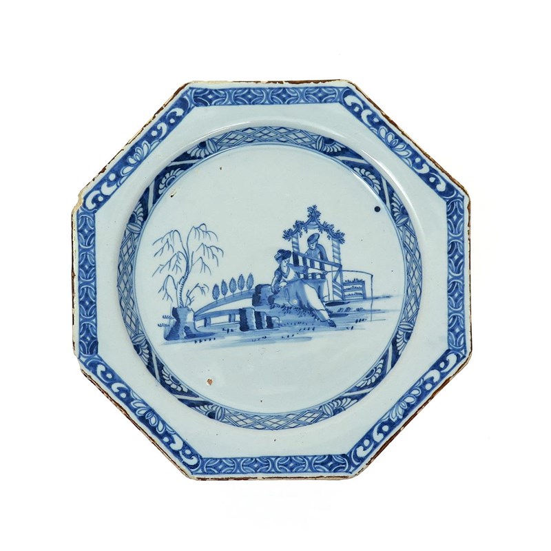 An octagonal delftware plate c.1770, Liverpool or Dublin, painted in blue with La Pêche, a lady fishing, regarded by a figure beneath an archway, within stylized narrow panelled borders, a chip to the rim, 22.7cm.