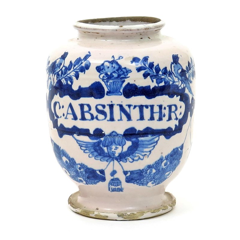 A Delft drug jar 18th century, titled in blue with 'C: Absinth:R:' within an oval cartouche beneath a basket of flowers and two birds, above an angel mask and fruit swags, some chipping, 17cm.