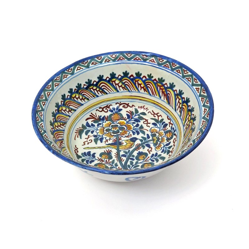 A London delftware bowl c.1705, brightly enamelled to the interior in shades of blue, green, yellow and red, with a bird perched on flowering branches within stylized borders, the exterior with a simple star and circle band, a section broken out and restored, 22.5cm dia.